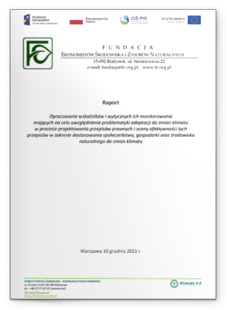 Raport „Opracowanie wskaźników i wytycznych ich monitorowania mających na celu uwzględnienie problematyki adaptacji do zmian klimatu w procesie projektowania przepisów prawnych i oceny efektywności tych przepisów w zakresie dostosowania społeczeństwa, gospodarki oraz środowiska naturalnego do zmian klimatu”