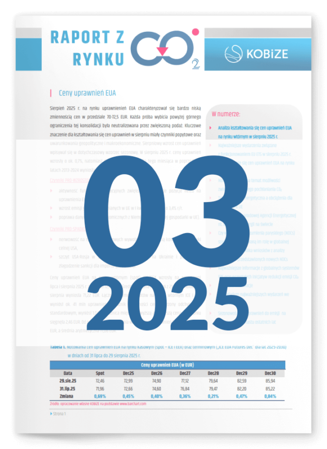 Zachęcamy do lektury kolejnego numeru „Raport z rynku CO2”, w którym prezentowane są informacje na temat kształtowania się cen uprawnień EUA na rynku pierwotnym i wtórnym oraz najważniejsze wydarzenia miesiąca związane z funkcjonowaniem EU ETS.