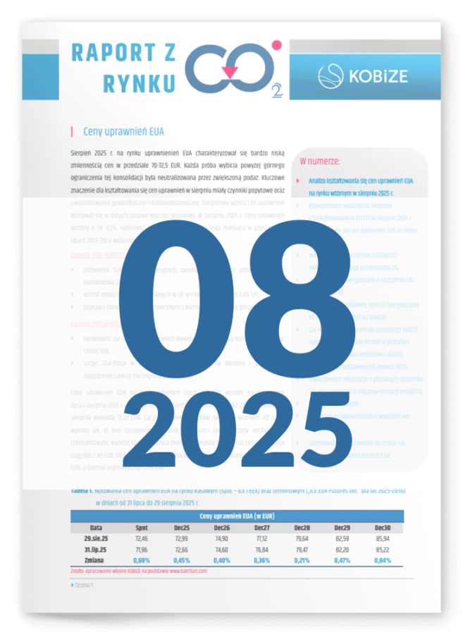 Zachęcamy do lektury kolejnego numeru „Raport z rynku CO2”, w którym prezentowane są informacje na temat kształtowania się cen uprawnień EUA na rynku pierwotnym i wtórnym oraz najważniejsze wydarzenia miesiąca związane z funkcjonowaniem EU ETS.
